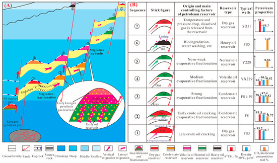 A diagram showing the gas invasion and fractionation model (A) and the dominant controlling factors (B) for the deep light oil reservoirs. In both maps, a sequence of oil and gas reservoirs that typically occur from deep to shallow in the basin is characterized.