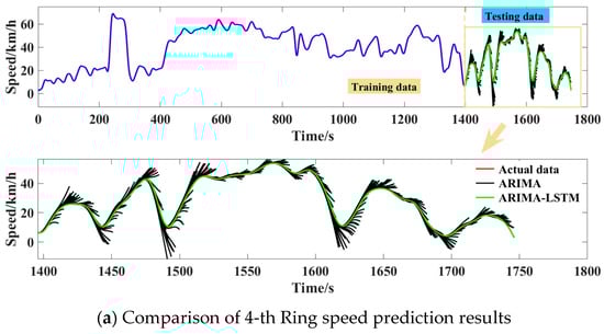 The above analysis of the error in the 15 s prediction time domain from the single-step prediction shows that the ARIMA-LSTM hybrid model is the most effective, and the following analysis of the whole test data from the multi-step prediction. As shown in Table 5, for the entire test data of the fifth average error results, it can clearly be seen that this is the same as the effect in the single-step prediction, for the first three conditions. To take the 4-th Ring as an example, from the ARIMA and LSTM to the ARIMA-LSTM hybrid model, the values of the RMSE are 1.1075, 0.5873, and 0.2440, the values of the MAPE are 4.29, 2.43, and 0.71, the values of MAE are 0.8251, 0.4774, and 0.1746, and the values of the error metrics are all decreasing in order. For the fifth prediction results of NEDC, using the RMSE as an example, the value of 1.1945 for ARIMA is less than the value of 2.3907 for the LSTM, which indicates that the linear data of this condition is dominant but the hybrid model’s performance is still optimal and the value of 0.3105 is the smallest.