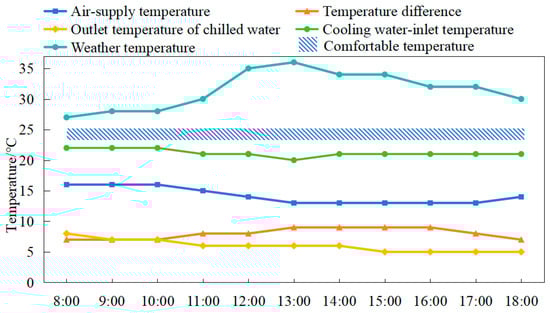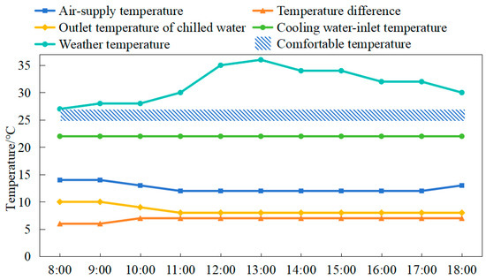 The outdoor temperature rises rapidly around noon, as depicted in Figure 2. Consequently, there is an increase in the cooling load demand of the system and a greater need for cooling capacity from the air conditioner refrigerator. After optimization, the cooling water-inlet temperature of the air conditioning system remains unchanged at 22 °C, while the outlet temperature of the chilled water decreases. Additionally, there is a reduction in the air-supply temperature adjustment and an increase in the temperature difference between the chilled-water supply and the return. The system keeps the room temperature within the comfortable temperature range of a human body in a relatively gentle change way, and achieves the purpose of reducing energy consumption. Compared with the unoptimized operation strategy of the air conditioning system in Figure 3, when the cooling load demand increases, the system chooses to rapidly reduce the air supply temperature, increase the temperature difference between the chilled-water supply and the return, reduce the outlet temperature of the chilled water, and reduce the cooling water-inlet temperature. As a result, the indoor temperature drops rapidly. However, the air conditioning system consumes a significant amount of energy and fails to maintain the room temperature within the comfortable range for human occupancy.