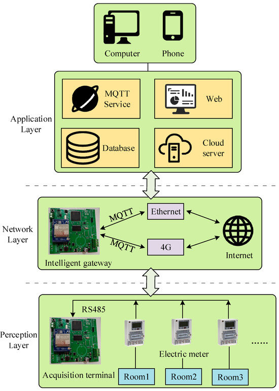 The hardware and software design of the acquisition system is based on the three-layer architecture of the Internet of Things, enabling the fulfillment of requirements such as data collection, analysis, transmission, and real-time monitoring of energy consumption data [45]. The overall architecture of the acquisition system is illustrated in Figure 4.