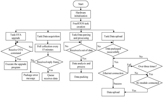 This design incorporates the FreeRTOS real-time operating system. The system employs RTOS multithreading for concurrent task processing, addressing modularity challenges while maintaining system real-time responsiveness [49]. After the initialization of hardware, the system initiates four tasks, which include an OTA (over-the-air technology) upgrade task, a data acquisition task, a data parsing and processing task, and a data upload task.