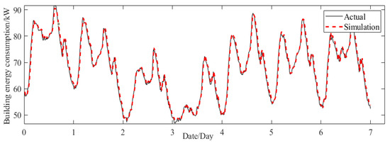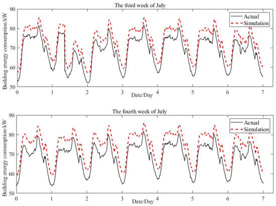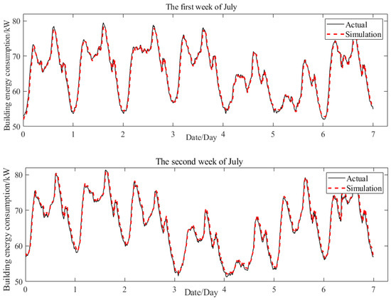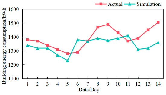 The data acquisition system records the energy consumption of the office building during the first two weeks of July and compares it with simulation results. As depicted in Figure 7, the simulation results closely align with the actual data, thereby validating the accuracy of the simulation system’s output. However, there is a maximum error margin of approximately 10% in the simulation results, indicating some instability within the system and preventing confirmation of the authenticity of the energy consumption-optimization scheme.