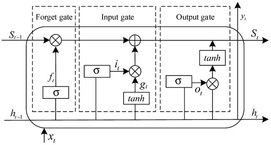 The LSTM, a type of recurrent neural network (RNN), consists of three essential gating units: the Forget Gate, Input Gate, and Output Gate [53,54]. In comparison to traditional RNNs, LSTM effectively addresses the issues of gradient vanishing and exploding by incorporating memory units and gating mechanisms. Moreover, it excels in capturing long-term dependencies within time-series data [55,56,57]. The LSTM structure is illustrated in Figure 8. The input component comprises the status information from the previous time step , the output information , and the input value of the current time step . The output component consists of the current status information and output value . Here, represents the output of the forget gate, denotes the output of the input gate, signifies the output of the output gate, while corresponds to the output of an input node. Additionally, refers to a sigmoid function.