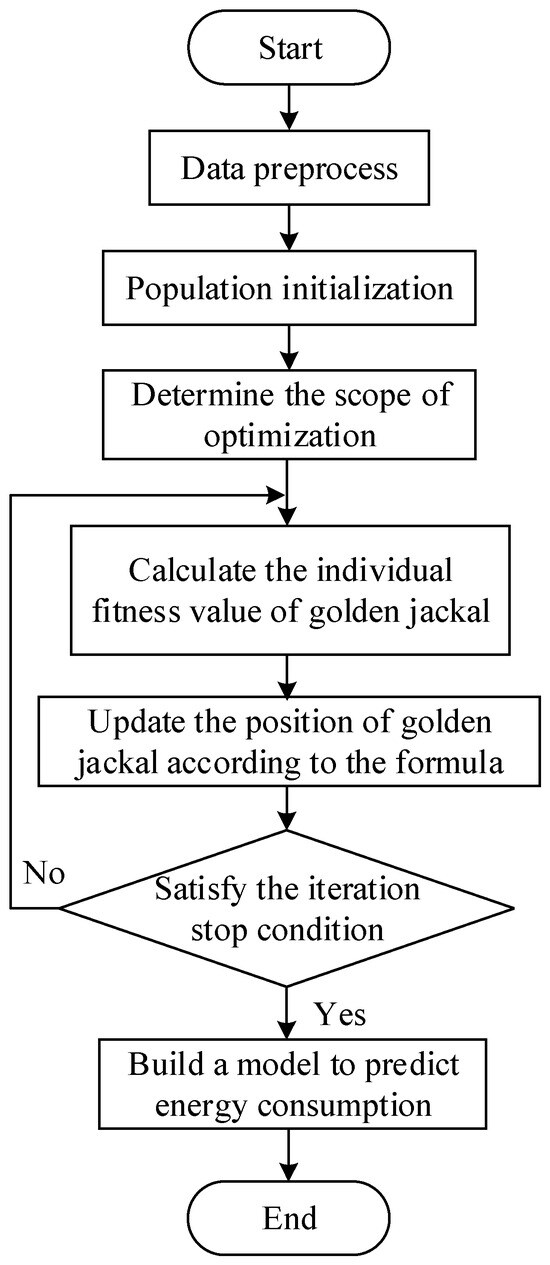 The golden jackal algorithm is inspired by the foraging behavior of golden jackals in their natural environment, and it aims to find the optimal solution through simulating social interaction and information sharing among individuals [58,59]. The golden jackal algorithm consists of two main stages: hunting for prey and rounding up prey.