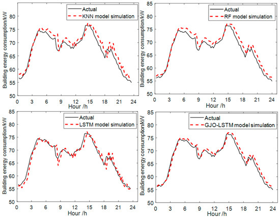 In order to further verify the performance of the GJO-LSTM combined prediction model, this paper selected a variety of algorithms for comparative experiments to predict the energy consumption of the same day in the future [60,61]. As shown in Figure 12, compared with other algorithms, the predicted energy consumption of GJO-LSTM has a higher degree of fitting at points with large fluctuations, and the prediction curve is significantly closer to the true value, with higher prediction accuracy.