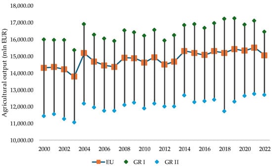 Regarding the utilisation of renewable energy in agriculture, the mean value was 6.18% in Group I and 25.54% in Group II. Poland had the highest proportion of renewable energy in agriculture in Group I (13.48%), while Portugal had the lowest (6.87%). In contrast, in Group II, Lithuania had the lowest use of renewable energy in agriculture (13.95%), while Germany had the highest (35.07%). The group variation is less pronounced regarding the final variable, pesticide consumption. The average pesticide consumption in Group I was 5.69 kg/h, while in Group II, it was 5.37 kg/h. The lowest consumption was recorded in Romania (0.66 kg/h), while the highest was in the Netherlands (9.76 kg/h). In Group II, on the other hand, the highest consumption was in Austria (9.76 kg/h) and the lowest in Sweden (0.62 kg/h). Group I is more homogeneous when all variables are considered, with a lower standard deviation than Group II.