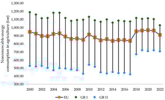 A graphical representation of the primary variables used in the model is shown in Figure 2, Figure 3 and Figure 4. Descriptive statistics for the series studied are shown in Table A1. Regarding the volume of agricultural production, it was relatively stable throughout the analysed period, characterised by minor fluctuations. In Group I countries, agricultural production was higher than in Group II countries. In the case of non-renewable energy consumption, this variable was also stable over the period studied. It was lower in Group II countries but also increased when the level of agricultural production increased. In contrast, non-renewable energy consumption in agriculture increased throughout the period studied in all groups, with a more significant increase in Group II countries. A preliminary analysis of the studied series reveals that while the share of renewable energy in European agriculture steadily increases, non-renewable energy plays a significant role. The demand for energy from fossil fuels increased mainly due to increased agricultural sector production.
