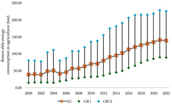 However, as highlighted by Roxani et al. [63], the construction of solar and wind power plants may harm food security due to reduced available arable land. In contrast, Rokicki et al. [52] highlight that the relationship between energy consumption and agriculture is a well-researched topic, although there is still a lack of clear evidence. Previous studies also indicate that the use of renewable energy in agriculture is highly variable across EU countries, with RES energy use being higher in the “old” EU countries [61].