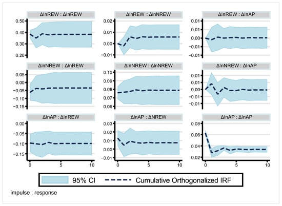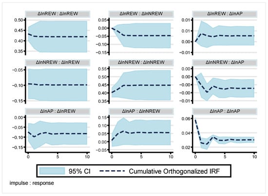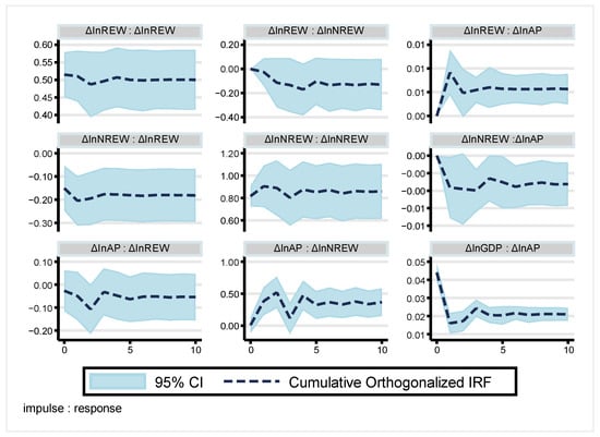 Table 7, Table 8 and Table 9 present the results of the panel VAR model estimation for all studied countries, Group I countries, and Group II countries. Table A2 displays the findings of the Granger panel causality tests. The model’s lags and instruments were selected based on the MAIC criterion and J-Hansen statistics. The results of the causality tests indicate a significant causal relationship between ΔlnNREW and ΔlnAP for all countries and individual groups studied. However, with respect to renewable energy consumption, the results show a causal relationship between ΔlnREW and ΔlnAP only in Group II. Additionally, there is a bidirectional causal relationship between the variables ΔlnNREW and ΔlnAP, as well as ΔlnREW and ΔlnAP, in Group II.