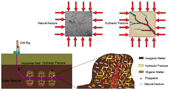 Due to the ultralow porosity and permeability of shale reservoir, hydraulic fracturing and horizontal wells are essential for shale gas exploration because they can create an irregular and complex fracture network, as illustrated in Figure 1 [40]. Proppants are injected into reservoirs to support hydraulic fractures during the gas depletion [5]. As previous work illustrated, the permeability of propped fractures plays a crucial role in achieving economic gas production. Therefore, in addition to the creep behavior of shale reservoirs, the creep characteristics of propped hydraulic fractures and natural fractures should be addressed. Also, its impact on gas depletion characteristics at the field scale needs to be investigated. Shi et al. [41] simulated well performance, considering long-term conductivity and shale creep based on the Kelvin–Voigt model. The main factors impacting production were considered, such as proppant size, proppant concentration, and shale viscosity. Yu et al. [42] proposed a novel time-varying fracture conductivity model based on fractional calculus to simulate the long-term decay of fracture conductivity. The impact of proppant deformation, proppant embedment, and shale creep on well performance was investigated using the embedded discrete fracture model (EDFM). While in these works, the characteristic parameter governing the creep behavior of hydraulic fracture is kept invariable, which may not be true at the field scale. The recent work suggests that more creep deformation can be observed under high effective stress [41,42], which may change dozens of MPa’s during the gas depletion process [40].