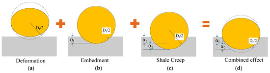 Proppants are injected into reservoirs with hydraulic fracturing to support hydraulic fractures and maintain high conductivity. The properties of both hydraulic fractures and proppants should be considered in the hydraulic fracture permeability model. To simplify the calculation process, the following assumptions are made [48]: (i) Proppants are assumed to be spherical with a uniform diameter, and crushing is not considered. (ii) The roughness of the hydraulic fracture surface is disregarded. During the gas depletion process, the proppant deformation and embedment should be considered in the permeability model of hydraulic fractures. In addition, the creep behavior of hydraulic fractures should be included because of their high clay content. The deformation process of the proppant is illustrated in Figure 4 [64].