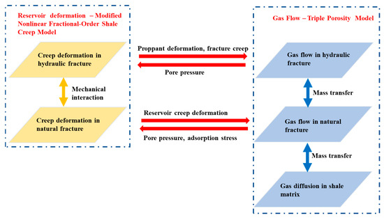 In this work, we propose a modified nonlinear fractional-order creep model to describe the viscoelastic behavior of shale reservoirs and hydraulic fracture systems via the triple porosity approach to describe the multiscale gas flow in shale reservoirs. The coupling process can be summarized in Figure 5 and described as follows: