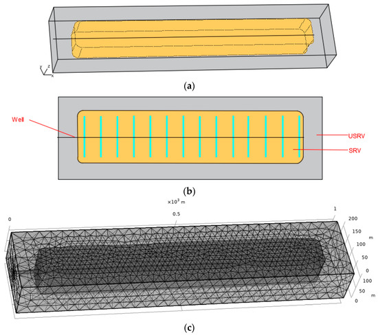 In the simulation model, the reservoir is set as a cuboid with a volume of 1000 m × 500 m × 100 m and a linked SRV of approximately 860 m × 100 m × 90 m. Figure 6 illustrates the geometry and meshing elements for the simulation model and SRV. For the meshing, the SRV region is extensively meshed with a maximum element size of 10 m and a minimum element size of 4 m. In contrast, in the USRV region, the remaining part of the simulation model is roughly meshed, and the finer feature in COMSOL Multiphysics is applied. After meshing, a total of 201,879 elements are generated, with an average quality rating above 0.8. The simulation is conducted using a self-assembled high-performance workstation (located in our lab Shenyang, China) equipped with a double Intel (R) Xeon (R) Platinum 8370 CPU and 256 GB of RAM. Each run of the simulation requires 90 min of computing time.