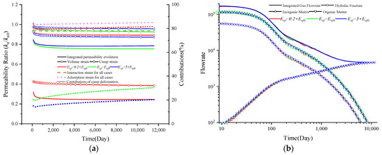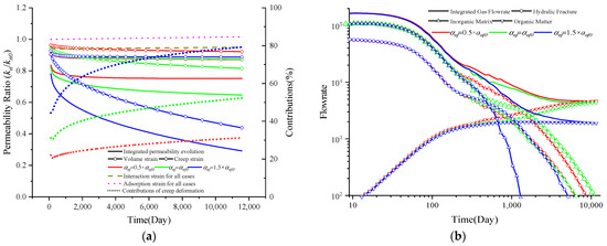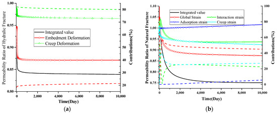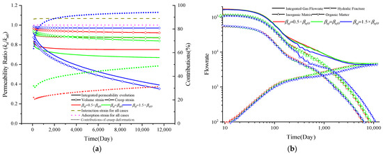 where εint represents the internal strain and εout represents the outer strain. Additionally, based on the observations between the internal strain and permeability evolution, an exponential relationship can be described to define the relationship between internal strain parameter and deformation time [63]:
