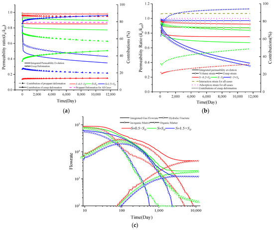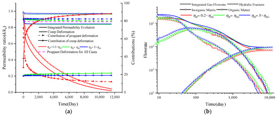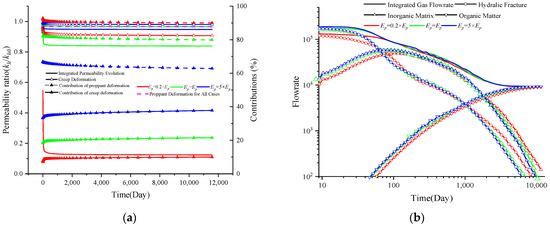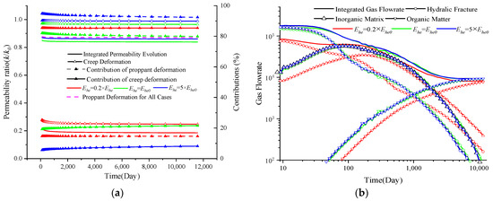 - The gas flow in the hydraulic fracture system impacts the creep deformation of the shale reservoir (Equation (12)) and enlarges the closure pressure—pc. As a result, the aperture and permeability of hydraulic fractures decrease following Equations (34) and (37). As a return, the variation in permeability impacts the gas flow characteristics in hydraulic fractures as defined in Equation (13).