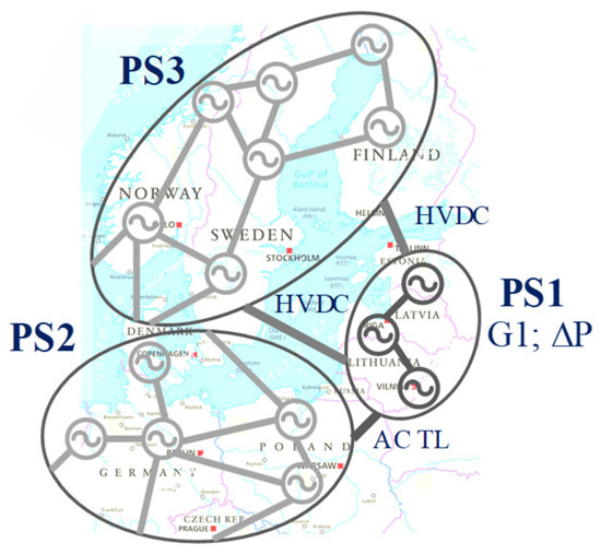 The Baltic power system (BPS) has been chosen to demonstrate the proposed approach. The BPS combines the power systems of the three Baltic States, namely the Estonian, Latvian, and Lithuanian power systems. It is a relatively small PS with a peak load of 4683 MW (EE: 1552, LV: 1100, LT: 2031), historically operated synchronously with the Unified Power System of Russia (UPS), which provides vast frequency and inertia reserves. To improve energy independence and security, a political decision [59] was taken to disconnect the Baltic PS from the UPS and to establish a new synchronous interconnection with the Continental European network via Poland in 2025 (through one double-circuit 400 kV AC line) [20]. The integration process has been started by introducing new HVDC connections with Finland, Sweden, and Poland. There is an HVDC interconnection between Estonia and Finland consisting of two DC cables (Estlink 1 and Estlink 2, the total capacity is 1.05 GW) (in 2024). The LitPol Link is an electricity link between Poland and Lithuania that connects the Baltic transmission system to the synchronous grid of Continental Europe. It has a capacity of 500 MW, and since 2021, it can operate in a synchronous regime. Another HVDC interconnector, NordBalt, connects the PSs of Lithuania and Sweden; its maximum capacity is 700 MW. To strengthen the BPS, three synchronous condensers rated ca. 305 MVA each per each Baltic country will be installed by 2025 [60]. There are plans to build a 500 MW underground pumped hydro energy storage plant in Paldiski, Estonia by 2031. The planned storage capacity of 6 GWh during a 12 h storage cycle is equivalent to Estonian households’ average daily electricity consumption [61]. In the future, up to 2050, a major transformation of the existing system is planned: high-capacity solar, wind, and synthetic methane power plants will be built, and plants producing atmospheric CO2 emissions will be shut down. The Polish national energy and climate plan makes provisions for building nuclear power plants in the 2030s, as well as developing wind energy [6]. With regard to interconnections, it is important to note that the TSOs are planning to increase the import/export capacity of the synchronous interconnections with Germany, the Czech Republic, and Slovakia by 2000 MW.