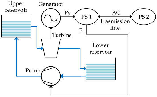 Pumped hydroelectric storage power plants represent the world’s most widely used storage technology with a total capacity reaching 159.5 GW [34,35,52,53,54]. PHSPP systems are designed to efficiently transfer water from a lower reservoir to an upper reservoir during periods of low-cost power generation, such as windy and sunny days [55]. Conversely, during times of increased demand or supply shortages, such as during the evening, the water is returned to the lower reservoir through a turbine, enabling electricity generation. PHSPPs have relatively swift response times (from zero to nominal power in a time span of 20 s to a few minutes. Typically, hydropower plants have from 2 to 10 (or more) runners, and the power of the units can reach hundreds of megawatts, while the round-trip efficiency can reach 0.8 [25,54]. It is important to emphasise that these units typically operate either in pump mode or in generator mode, and these two cannot function simultaneously (see Figure 5), as highlighted by Natalia Naval [52]. However, the restriction on the simultaneous operation of these modes is driven by economic considerations, as in this case, the energy consumed by the pump exceeds the energy generated by the generator, leading to seemingly unjustified economic losses.