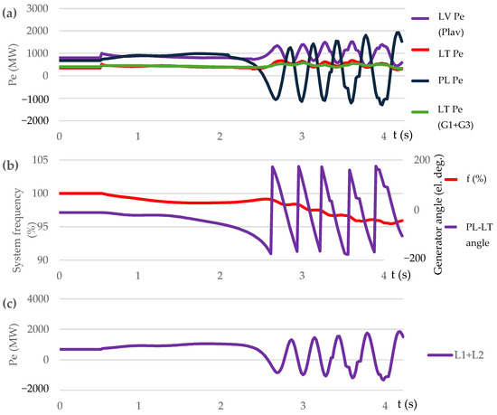 The PS1 deficit was overcome by importing power from PS2 over the TL (point a in Figure 2b). For a sudden outage of the major generation source in PS1, power deficit occurred, and a number of things happened. Immediately after the generation loss, the power deficit was redistributed among the remaining generators of PS1 and PS2. The kinetic energy of the rotational mass of the generators’ rotors ensured power balance at the very first moment but, as the inertial response decayed, the generators started to decelerate and the system frequency started to decline. In response to the frequency decline, the generators gradually increased their power, but the generators of PS1 were already operating at their maximum power and, thus, the power transfer over the TL was gradually increased by the amount (from point a to point c, Figure 2b). In case the acceleration energy of generator PS2 (area abc in Figure 2b) needed to regain power balance in point c became greater than the maximum available deceleration energy (area cde in Figure 2b), angular instability may have arisen between the generators of PS1 and PS2, resulting in the loss of synchronism and an out-of-step condition along the transmission line.