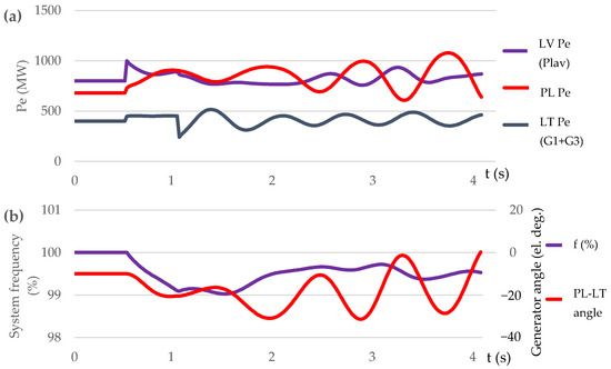 Such fast injection of additional power in PS1 was implemented on a rising slope of the power–angle curve (Figure 3a), or even on a falling slope, when the angle exceeded π/2 (Figure 3b). Fast injection of power assumes that there must be generation capacities in the PS1 system that are already in operation, being synchronised with the system but without supplying any power.