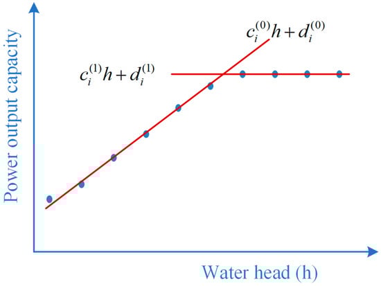 - The capacity of hydropower output due to the release available isand water heads are expressed aswhich, as illustrated in Figure 1, is equivalent towithwhere Ai is the power generating efficiency in MW·s/m4; hit is the water head in time-step t of hydroplant i; Gimax (·) is the capacity of hydropower output of i, a function of water head; and are coefficients to be estimated to fit the power output capacity with piecewise linearization; Ziu (·) and Zid (·) are forebay and tailwater elevations, dependent of the water storage and release, respectively, of reservoir i; and are coefficients/parameters to be estimated for the relationship curve between storage and forebay water level.