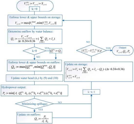 - The water is balanced when updating the storage and release with the following:The hydropower output is determined by considering its capacity and available release, as follows:where is the available release originally determined by the target storage (Si,t+1) and should also be targeted when updating the water head to accurately estimate the hydropower output capacity.