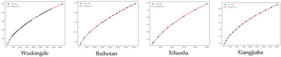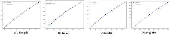 Table 3 and Table 4 presents the parameters estimated using the nonlinear least squares method in PyCharm, which are used to define two exponential functions representing the relationship curves of the forebay water level vs. reservoir storage and the tailwater level vs. release. The nonlinear least squares method is a powerful optimization technique that fits nonlinear models to data by minimizing the sum of squared residuals. The coefficient of determination (R²) measures the fitting accuracy, which has an outstanding value of 99% for all four reservoirs. Figure 4 and Figure 5 illustrate the relationship curves for forebay water levels and reservoir storage volumes, as well as tailwater levels and discharge volumes, respectively, providing a visual representation of the fitting outcomes.