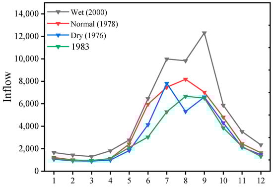 The runoff series generally follows a Pearson’s Type III probability distribution; statistical parameters are determined using frequency analysis to establish criteria for categorizing runoff into wet, normal, and dry years. For instance, the hydrological years 2000 (wet year), 1978 (normal year), and 1976 (dry year) are selected as examples, with corresponding probability percentages of 7.5%, 50.9%, and 86.0%, respectively. To illustrate hydrological trends, Figure 6 depicts the inflow volume into the headwater power station for these representative years, along with the inflow volume data from 1983 used for a comparison with SQP [].