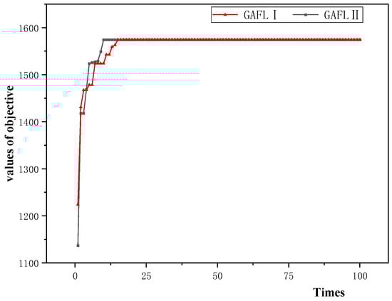 Table 7 outlines the CPU times for both methods and the genetic algorithm’s parameters. It is noteworthy that the CPU time for GAFL2 exceeds that of GAFL1, primarily due to a significant enhancement in the push–pull process within GAFL2. The parameters for these methods are based on prior research and have undergone subsequent refinement []. The stopping criterion for the algorithm is termination upon the completion of the designated number of iterations.