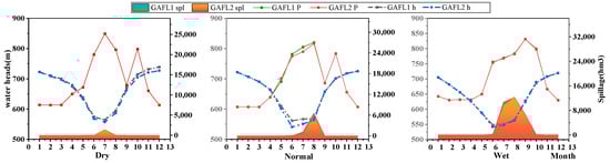 To elucidate the anomaly observed in normal years, as shown in Table 8, Figure 8 compares the scheduling processes of the GAFL1 and GAFL2 algorithms across three typical hydrological years, examining monthly energy (P), water head (h), and spillage (spl) in cascade reservoirs. It is observed that during both wet and dry years, the differences in h under the two methods are minimal, thus allowing for an increase in energy generation concurrent with reduced spillage. However, in normal years, despite a reduction in spillage, there is a significant decrease in head, which does not substantially aid in increasing energy generation. This leads to the phenomenon reported in Table 7, where a decrease in spillage during normal years does not increase energy generation, but rather causes a decrease. This discrepancy highlights the complex interdependencies between head, spillage, and energy generation under varying hydrological conditions.