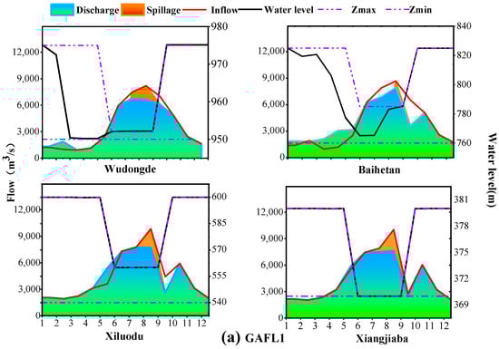 Figure 9 shows the monthly scheduling processes of (a) GAFL1 and (b) GAFL2, detailing the operation of the four reservoirs along the Jinsha River during a normal year. In this context, Zmin represents the minimum water level for the year, typically set as the dead water level, while Zmax corresponds to the upper water level limit, enforced as the normal water level during the dry season and the flood control level during the flood season. By comparing the reservoir outflow (area charts of spillage and generation discharge) with the inflow (red line), the storage and release dynamics at different times can be analyzed. When the inflow exceeds the outflow, the reservoir stores water, causing the water level to rise; conversely, the reservoir releases water, causing the water level to drop. Both GAFL1 and GAFL2 methods yield reasonable results, storing water during the dry season and releasing it during the flood season, thereby minimizing spillage, maximizing hydropower generation, and ensuring optimal utilization of water resources.