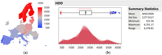 Heating degree days index in EU [31]. (a) left—countries comparison. (b) right—distribution analysis HDD.