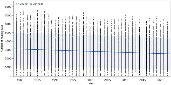 The development of the indicator over time showed a decrease in the number of daily heating degrees per year by 13 units (Figure 2). This is indirect evidence of climate warming, as the number of days when it is necessary to heat is decreasing.