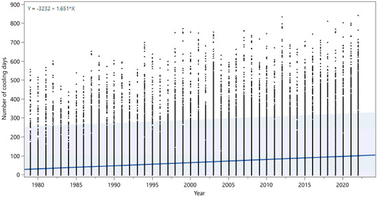The development of the indicator number of cooling days over time points to an increase in cooling days by 1.65 days per year (see Figure 3). The linear increase can have various consequences, such as changes in crop production, energy needs, or the environment. It is important to monitor such trends and take measures to adapt to a changing climate. If the number of cooling days increases, it may be related to meteorological phenomena. For example, radiative cooling occurs at night, when the air temperature at lower altitudes drops significantly. Advection cooling is caused by the flow of cold air into the middle layers of the troposphere. These phenomena can affect the weather and temperature in a given region.