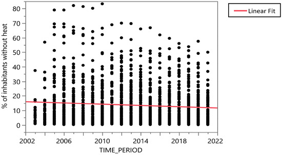Based on these facts, we analyzed energy poverty, which is mainly linked to the indicator of heated days. Energy poverty was assessed through the percentage of the population that could not maintain adequate heat at home. Figure 4 illustrates the development of the indicator in time when Linear Fit presents the percentage of inhabitants without heat = 451.31242 − 0.2174527 × TIME_PERIOD.