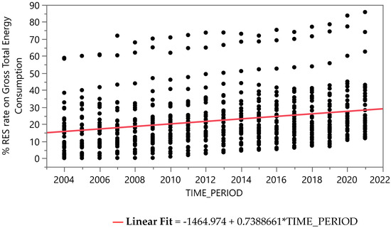 The development of the share of RES in gross total energy consumption is shown in Figure 7, which shows the trend over 18 years, with an annual increase of 0.74%.