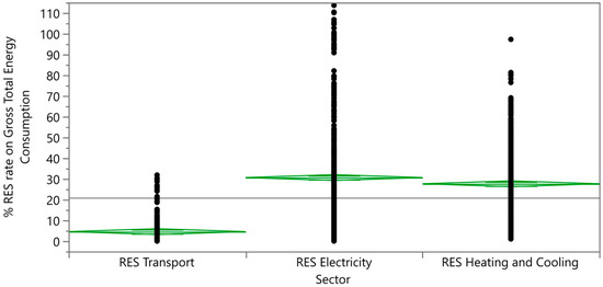 From the one-way analysis of % RES use on gross total energy consumption in Figure 8, we see that the highest mean value is recorded for RES use in electricity at 30.6%, with slightly lower use in cooling and heating at the level of 27.63%. However, the RES use in transport is much lower–only 4.5%. Here is the space for a significant improvement (Table 3).