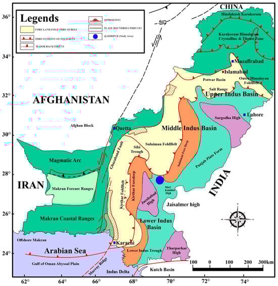The Indus Basin in Pakistan stands out as among the most extensive basins formed by the Himalayan tectonic event [41,42,43,44]. It is partitioned into three distinct sections, namely, the Upper Indus Basin, Middle Indus Basin, and Lower Indus Basin, each delineated by its structural characteristics, depositional environments, and geological compositions, as shown in Figure 1 [45,46]. The current research area is positioned in the Middle Indus Basin (MIB). The Qadirpur region’s source rocks comprise the Sember shale, Mughalkot shale, and Ranikot shale [47]. Moreover, the Sirki Formation was scrutinized for its potentiality as a source. In Pakistan, nowhere else the Sui Main Limestone is detected. The Pirkoh as well as Habib Rahi Limestones are contemplated secondary reservoirs, whereas the key reservoir and gas source is ascribed to the Sui Main Limestone and Sui Upper Limestone, correspondingly [47]. The cap rock within the current study consists of Gazij shale and Sirki shale, as shown in Figure 2. The Indian Shield is positioned east of the Middle Indus Basin, with the borderline of the Indian Plate to the west and the Sukkar Rifle originates from the south [48,49]. The prime tectonic activity formatting the structural drifts and sedimentary shapes in the Middle Indus Basin, from Jurassic to Early Cretaceous, corresponds to the Indian plate’s separation from Gondwanaland [50]. Aside from rifting, the creation of a new ocean caused isostatic uplift along its borders, resulting in uplift and slanting to the east during the early Cretaceous period. During this period, the dynamic movement of Cretaceous plate tectonics could have instigated sinistral strike-slip faulting, as well as the emergence of hot spots and thermal doming lengthwise to the boundary among Madagascar and Indian plate [51]. Subsequently, uplift occurred within the Deccan flood basalts along with NNW striking normal faults [37].