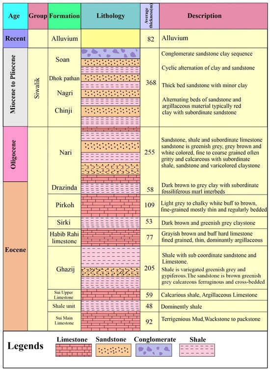 The impact of the Himalayas during the Oligocene period and up to the current time proceeded in sinistral transgression in the western zone of the MIB. This collision led to the surprinting of fold-thrust characteristics with sinistral flower features [52]. The principal structural forces in the area were the inclining fault blocks across the horst–graben morphological pattern. The geological as well as tectonic procedures in MIB could be considered to pre-separation and post-separation epochs [53]. Prior to the parting of the Indian peninsula from Gondwanaland, it remained a portion of this supercontinent. The Afghanistan–Iranian geological units separated from Gondwanaland amidst the Triassic period. Mesozoic sedimentation happened in the platform area, with disruptions in sedimentation resulting after the displacement of orogenic plates [47]. Facies dissimilarities within the MIB are largely controlled by three elements: tectonic motion, sea level vacillations, and sedimentation rates, documented in descending command of significance [54]. In the examined region, rifting triggered rapid marine transgression, influencing marine sedimentation. The Paleocene era trails the incidence of tectonic events within the Sulaiman Fold Belt [55]. During the Eocene epoch, a geological period characterized by substantial tectonic activity, a succession of thrust faults developed along the eastern perimeter of the Sulaiman region. These faults, revealing strong geological forces, extended further southward, crossing over the Marri-Bugti sector. The disruption of the Indian plate and the tectonic events exerted by the Afghan block culminated in the creation of the Sulaiman-Foredeep [56]. The stable unit of the Punjab Platform is placed within the eastern zone of the Sulaiman-Foredeep.