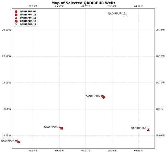 Base map of the Qadirpur gas field demonstrating well locations.