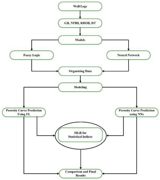 Porosity examination is crucial in the comprehensive estimation of rock formations for accurate assessment [1]. It characterizes the storage capacity for oil and natural gas in the proposed zone [2]. In this regard, earth science exploration encounters obstacles as a consequence of uncertainties, errors, and unproven associations between datasets in geophysical logs [3,4,5]. These challenges are deep-rooted in matters like inadequate logging in long-standing boreholes, imprecisions in estimations owing to hole circumstances, and technical glitches that lead to unreliable log suites [6,7,8]. Hence, the current research scrutinized the fuzzy logic (FL) approach utilizing Gaussian-shaped membership functions and the artificial neural network (ANN) method to achieve precise prediction and analysis of the porosity curve among five well log dataset. Machine learning (ML) methods like federated learning (FL) and ANN have been demonstrated to be competent in handling intricate challenges exemplified via environmental impulsiveness and evidence uncertainty [9,10,11]. The current research makes a substantial contribution by producing a porosity curve from the well log dataset. Furthermore, it examines how an ML technique can efficiently evaluate hydrocarbon-bearing reservoir parameters in the absence of a core dataset [12,13]. Earlier research has implicated forecasting the porosity curve, exploring the appropriateness of ANN and FL procedures in the Fahlian limestone reservoir in Iran, utilizing DT, GR, NPHI, and RHOB well logs [14]. Wood, David A. documented that ANN trained with the DT log and the GR log was capable of predicting porosity cure [15].