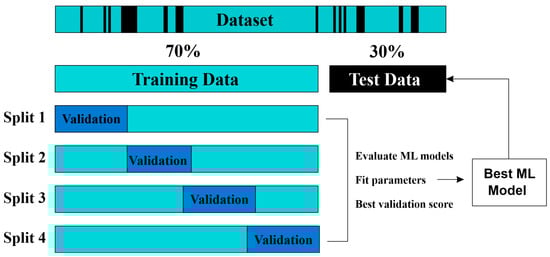 ANN and FL approaches have uncovered widespread applications in ML across geological sciences [73]. The fundamental ANN is comprised of an input layer, an output layer, as well as additional hidden layers [74]. The initial layer comprised unrefined data, which is specified to the network, and the values in this layer remained unchanged [74]. Each input to the system was replicated and supplied to the nodes in the hidden layer. The hidden layer obtained data from the input layer, altering those with explicit weight values to yield new values [75]. These recently obtained values are then conveyed to the output layer. Afterward, the output layer operated the data acquired from the hidden layer and created the ultimate output. The data operated for evaluating the ANN were characterized among three sets: training, validation, and testing. Data for training encompassed altering the interior structure of the network, whereas validation involved evaluating the network’s performance throughout its training segment. A testing dataset was employed to assess the reliable potency of the trained network. To lessen errors and accomplish optimal output, ANN training was carried out on reservoir zones across each iteration showing a training sequence for the ANN. An epoch, or training cycle, encompasses displaying all the training datasets onto the network across the training progression [76]. The term “epochs as per step” states the frequency at which the training data are strained from the training sets and fed throughout the ANN across every training session. To validate the training results, the dataset endured K-fold cross-validation [77]. In the current study, both random subsampling as well as K-fold cross-validation approaches were applied to increase the robustness of the porosity curve prediction and decrease uncertainty. The existing dataset comprised numerous wells, which were arbitrarily divided into a 70% training dataset and a 30% testing dataset. To avoid overfitting and assess multiple candidate ML models, K-fold cross-validation was applied, with a four-fold size selected to resemble the number of samples in the final valuation testing set. Figure 5 demonstrates the overall ML workflow, including the implemented K-fold cross-validation procedure.