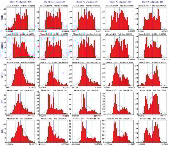 QGF-well 03 Bin histograms (bins 1–5) depict the fitting of the Gaussian membership function to the POR/predicted porosity curve, GR, NPHI and DT logs. Mean values and SD are indicated by the blue line.