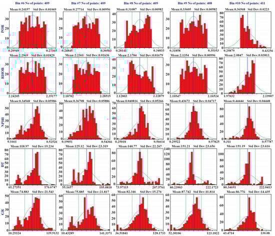 QGF-well 03 Bin histograms (bins 6–10) depict the fitting of the Gaussian membership function to the POR/predicted porosity curve, GR, NPHI and DT logs. Mean values and SD are indicated by the blue line.