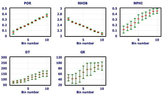 During the modeling progression, the selected data endured the obligation of bin boundaries by fuzzy sets [88]. Porosity readings were dispersed over cross-bin boundaries, wherein Gaussian disseminations were fitted to each bin. Quantization either binning of data aided as the extensive mechanism for numeric value processing in ML. In this setting, the dataset was characterized through bins stranded on log curves, signifying appropriate bin spots, including widths to consistently allocate the equivalent number of samples (Figure 6, Figure 7 and Figure 8). The estimation of a bin’s probability integrated the number of samples confined within it. In the building of the FL model, the sum of 409 data values from individual bins has been used.
