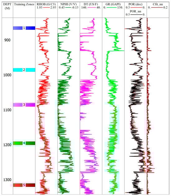 Log plot highlighting training zones used in ANN for porosity curve prediction.