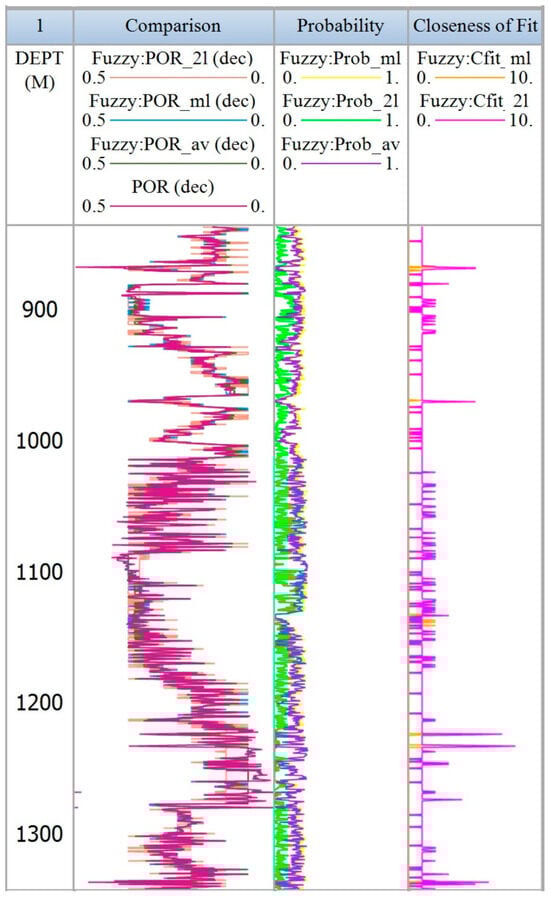 The FL model was employed on the well log dataset, using the training statistics. Afterward, a probability estimate was derived for the fitting of porosity curves for each individual well [89]. Consequently, the solution, represented as the final probability (Pi), was resolute by choosing the result with the maximum possibility. The subsequent output curves contained the most possible setting, depicted the outcome with the maximum probability; the following utmost likely setting delineated the outcome with the second-highest probability; and the weighted typical second most probable situation, which was a weighted mean of the two utmost possible decisions [89]. The closeness of fit (Cfit) readings portrayed in the output curves aided as a reliable measure of the quality and accuracy of the outcomes. The curve contrasted the outcome and the original curve applied in creating the model using bin distance as a metric [89]. The percentage deviation from the elected result operated for generating the low and high probability outcomes was 25%. This research utilized 10 bins, and all bins were evenly sampled. Class interval or bin is an approach to arrange or classify datasets within a histogram. The prime of 10 bins was completed to lodge the comprehensive well log dataset of the Sui main limestone reservoir zone of interest whereas keeping equal-sized bins in clusters of ten. Evenly sampled bins were utilized to initiate data maximums along with minimums for each curve founded upon the input information. The modification of bin arrangement confirmed an identical extent of data in each bin, although it is possible that this procedure might not constantly produce an identical value in each bin.