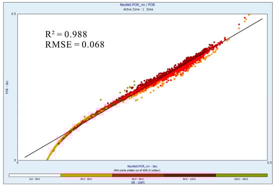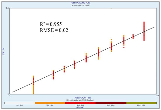 To improve the estimation of the accuracy accomplished by the FL and ANN methods, an additional calculation was executed applying root mean square error (RMSE) upon the similar data. That metric was an arithmetical measure which counted the anticipated square of the disparity between the observed and predicted values of the porosity curve. RMSE assisted as an extensively implemented criterion for determining the prediction authenticity of any model [92]. The RMSE value could be employed in the following formula: