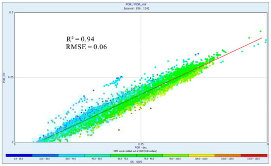 Demonstrates the R2 between the actual curve and the predicted porosity curve applying MLR.