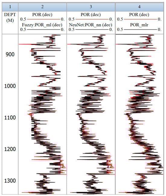 The present investigation emphasized the consistency of ANN as well as FL for the wells considered across the QGF. Nevertheless, ANN offered a more precise alignment with genuine and predicted porosity curve. The FL model recommended a minimal variance between real and predicted values. In general, the ranges of DT and GR values exhibited consistent patterns without significant variations across the dataset. The porosity curve predicted by the FL model exhibited a close correlation, though with a minor tendency to overestimate. The prime objective of this regression assessment was to scrutinize the connection between a response variable and a predictor variable. The R2 value obtained from MLR scrutiny of the porosity curve was 0.94. Meanwhile, FL model R2 values were recorded 0.955, as well as ANN model R2 values were notably higher 0.988. These R2 values were derived by cross-plotting the real and predicted porosity curve across the FL, ANN and MLR. The suggested models ANN and FL exhibited adequate authenticity, resulted in a robust alignment between the predicted and real porosity curve. The consistency of this alignment was further validated through the RMSE assessment, illustrated in Figure 11, Figure 12 and Figure 13. Although ANN and FL algorithms have not been broadly discussed in the literature regarding their pros and cons, integrating these techniques aimed to harness the benefits of a neuro-fuzzy framework, thereby enhancing outcomes in resource exploitation and development [30,64,69]. Figure 14 graphically characterized the definite and predicted porosity curve of ANN, FL and ML, and demonstrated excellent precision alongside a vigorous correlation with the predicted and observed data. In situations with incomplete datasets, these methods exhibited robustness and were effective for reservoir modeling. These results proposed convincing indications concerning the efficiency of the predictive models, signifying their potency as substantial tools for forthcoming applications. The flexibility and usefulness of these practices in modeling geological well log data were manifest, predominantly in circumstances with inadequate information.