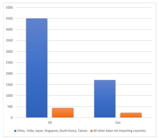 The concentration of Asian imports of oil and gas products among all net importing countries of Asia in 2021, in billion USD. Source []: Authors and the UN Comtrade database.